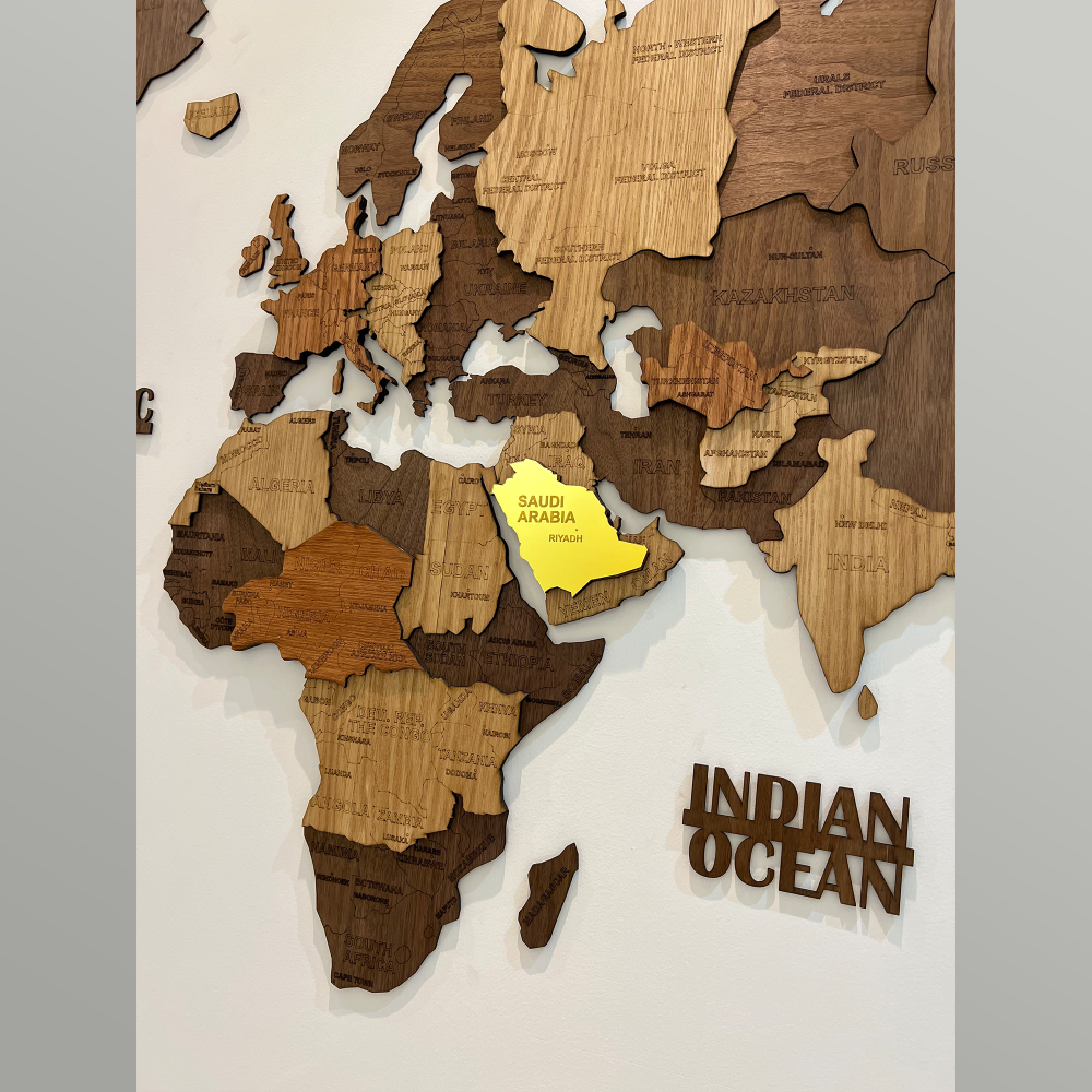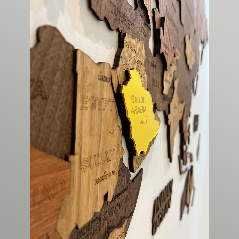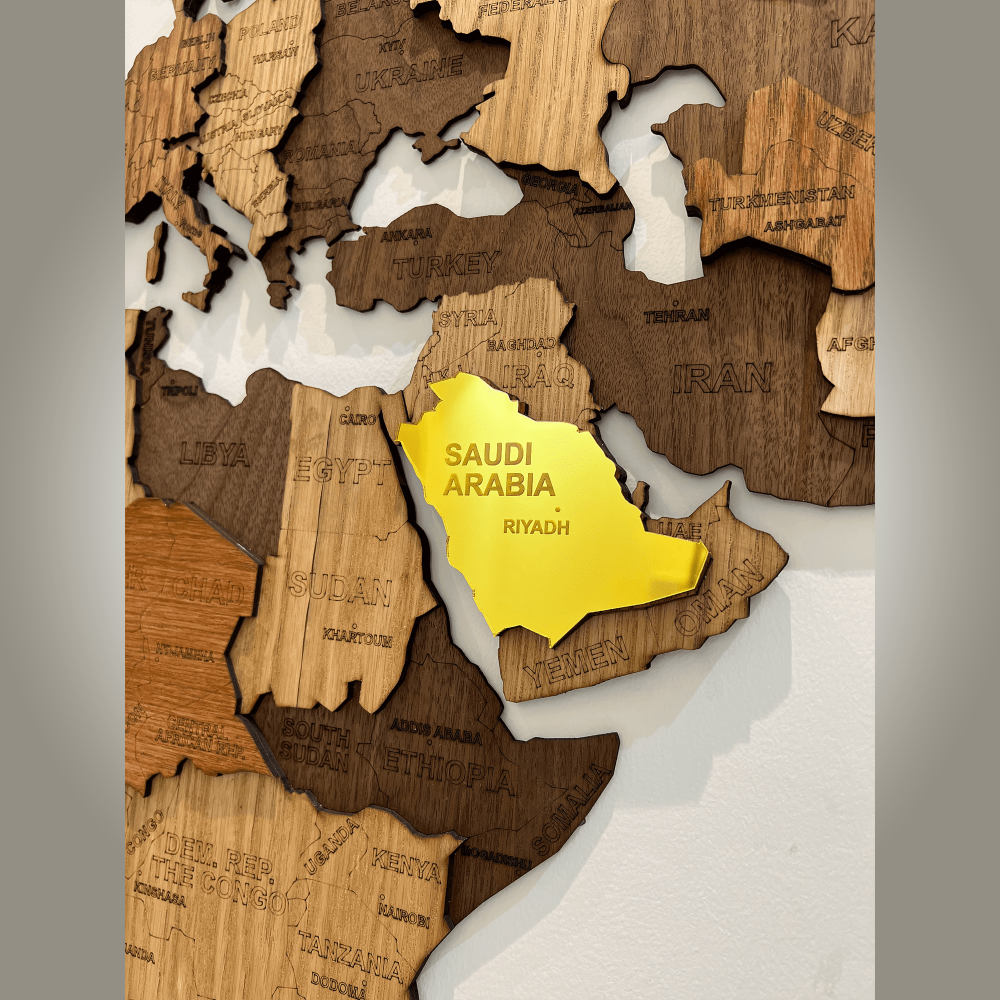 خريطة العالم ولون المملكة العربية السعودية باللون الذهبي - خشبية